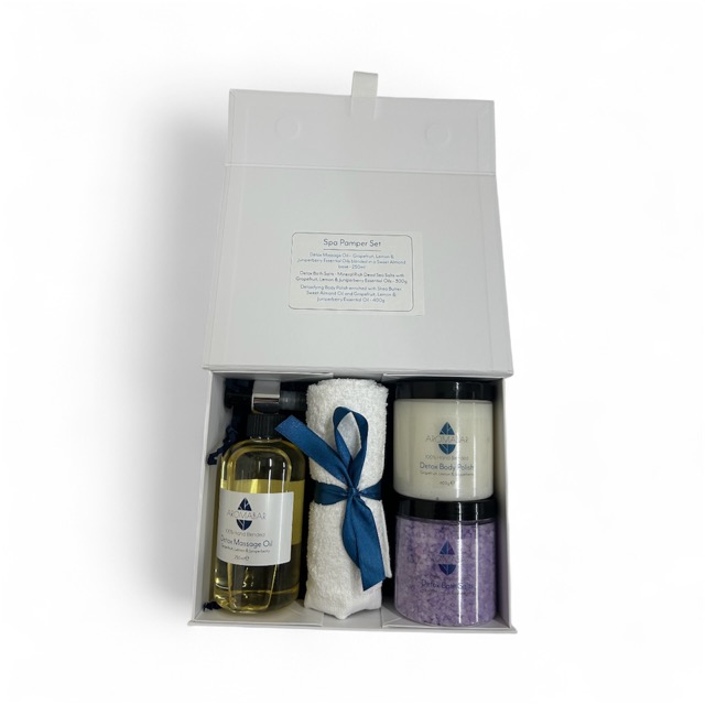 The Spa Detox Pamper Gift Set features a selection of our most popular products, specifically chosen to provide a complete pampering experience. Within this luxurious set, you will find our revitalising body scrubs, hydrating oils, and aromatic bath products. Each item is formulated with high-quality ingredients, such as essential oils and natural extracts, to cleanse, refresh, and nourish the skin. This thoughtful combination ensures that the recipient feels rejuvenated and revitalised after use.